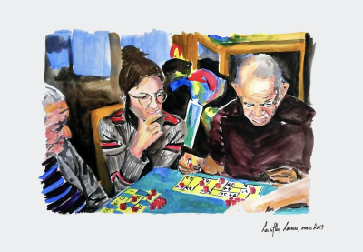 Il s’en est passé des choses depuis : on a tagué les abords de la maison, avec Patricia qui nous regardait en fumant sa cigarette et ne nous a pas épargné de ses commentaires d’une franchise détonante. On a partagé des repas d’anniversaire, on a aidé à l’animation d’un loto qui a tourné au pugilat parce que Mme X qui n’entendait rien criait à voix haute des numéros qui n’étaient absolument pas sortis. On a chanté aussi. On a assisté à des engueulades, à des fou-rires, à des moments de complicité entre équipes et résidents. On a réfléchi, beaucoup, avec les acteurs de la culture locale, les associations, les acteurs institutionnels et les citoyens pour imaginer et concrétiser cette nouvelle programmation de la vie locale au sein de la maison de retraite : est-ce qu’on relocaliserait pas les répétitions de la troupe de théâtre ? pourquoi pas en faire le point relai de paniers paysans ? et si le cinéma itinérant posait ses valises dans la salle d’animation ?
