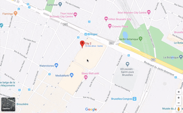 Lorsqu’une rue commerçante jouxte un centre commercial, la représentation graphique de Maps attire l’attention sur l’intérieur du centre commercial — alors même que la Rue Neuve, ici, est une des rues les plus commerciales de Belgique.